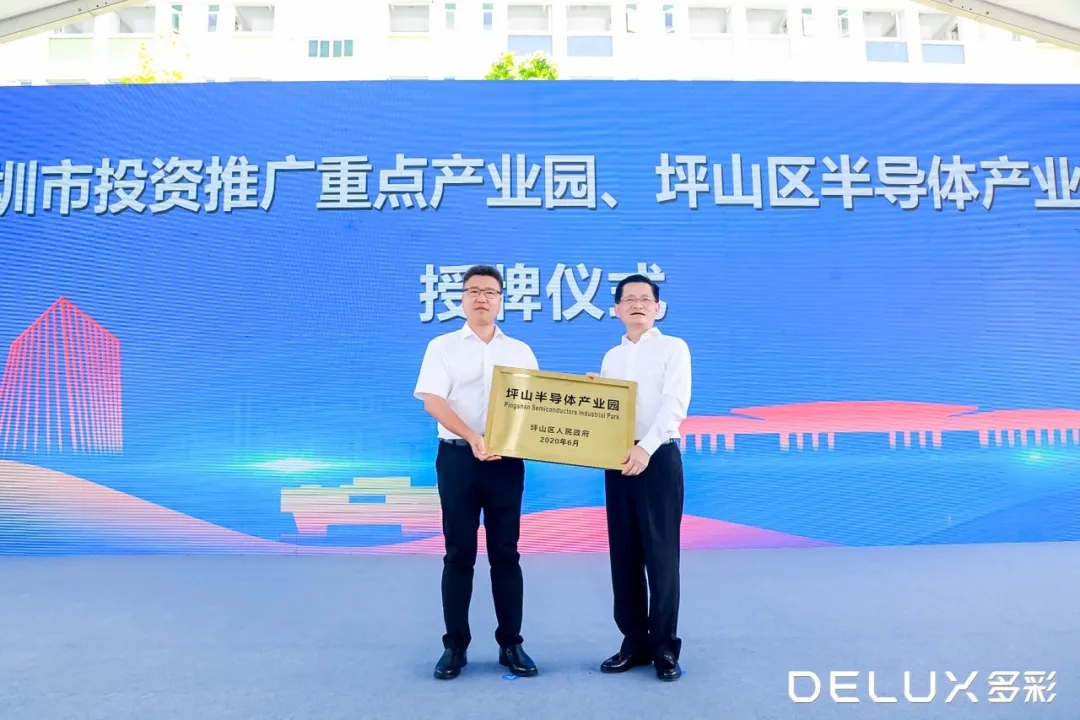 坪山區副區長陳華平為多彩科技園授“坪山半導體產業園”牌匾。